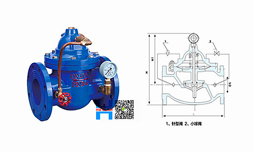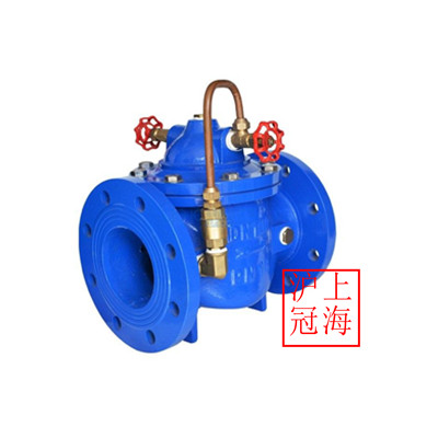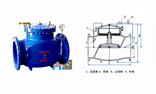 二、 工作原理 当阀门从进口端给水时,水通过微型过滤器、针阀、单向阀进入主阀控制室,再经过球阀排水至下游。因为针阀开度小于球阀开度,即主阀控制室的排水速度大于进水速度,因此控制室压力降低,作用于主阀盘下端的进口压力打开主阀向下游供水。